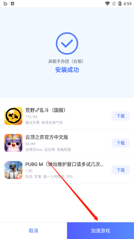 等到这款手游下载安装完毕后,系统会跳转到如下界面。此时如果大家之前有玩过非国服的游戏即可点击右下角的“加速游戏”开始加速。