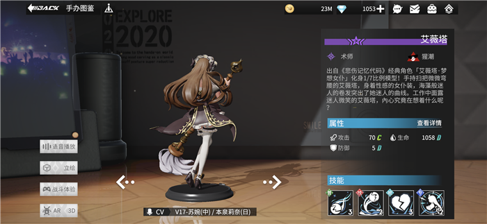 艾薇塔属于猩潮阵营的术士,打扫的女仆装十分好看,同时他的中文配音是苏婉-日文配音是本泉,很多玩家因为配音而培养女仆艾薇塔。虽然艾薇塔手办造型人气十分高。但艾薇塔手办为紫色手办基础属性不如金色手办好,攻击只有70评价C,生命为1058评价D,防御为5评价D。