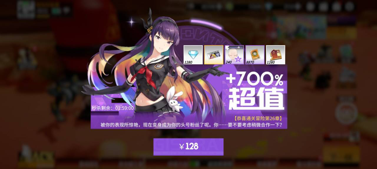 月卡和周常活动6元礼包以及成长基金,这三种礼包显然是游戏里最应该购买的,实际上钻石的主要作用就是抽手办,稍稍次一档能相对多的获得手办的礼包推荐充电计划。对萌新来说,128块的充电计划不可以直接购到,要推主线地图到第十章的时候,商城中才会多出充电计划,这个氪金机制和成长基金相似,何时购买都能马上拿到现在活动进展的奖品。