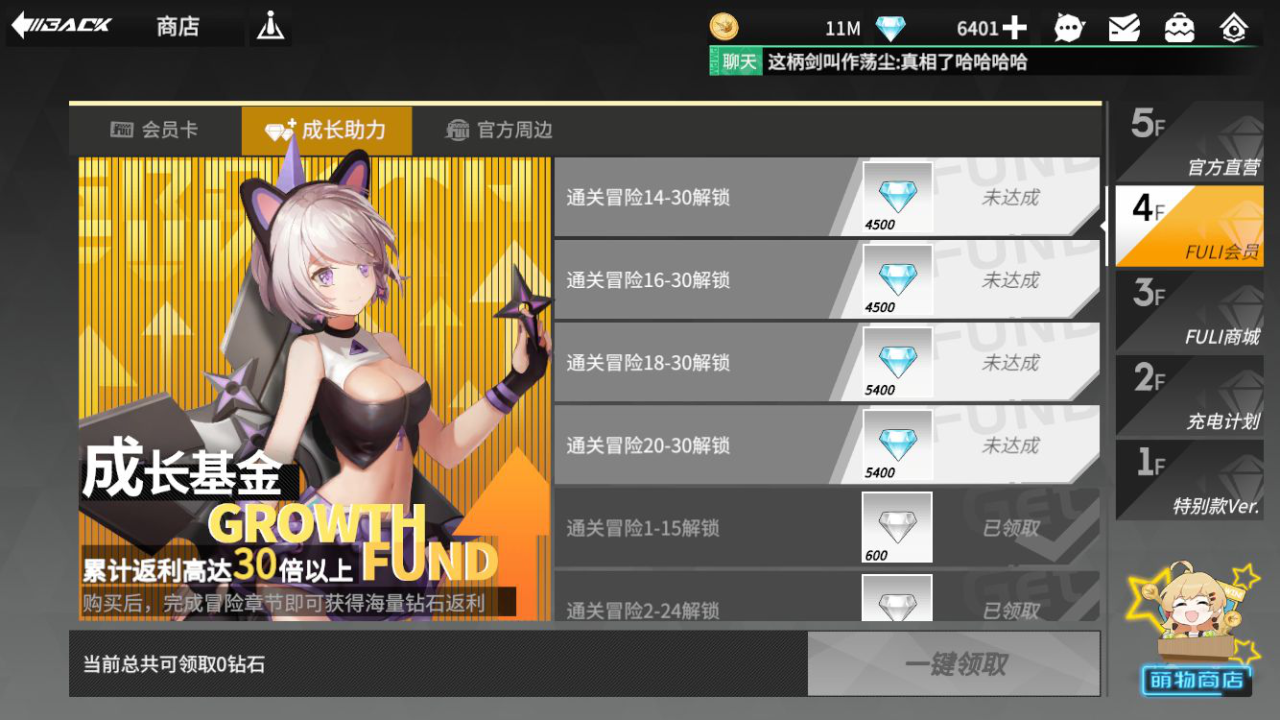 撇开月卡和6元礼包以外,萌新还有一个最超值的礼包是成长基金,这一个128块的礼包是依据推图的进展来返还钻石,推完20章的地图能领的钻石加起来共有41400,等同于32倍返还!但是小编温馨提示,非氪金玩家要推过主线地图20章拿全奖品要耗费的时间十分长,快则一月慢则两月,你买礼包的话也不需要心急,这一个礼包每一个账户只可以购买1次,买来之后就没有做任务的时长限制了,用不着特地去肝,高能手办团的主旨可是做1个只要轻轻动脑就能护肝的游戏。
