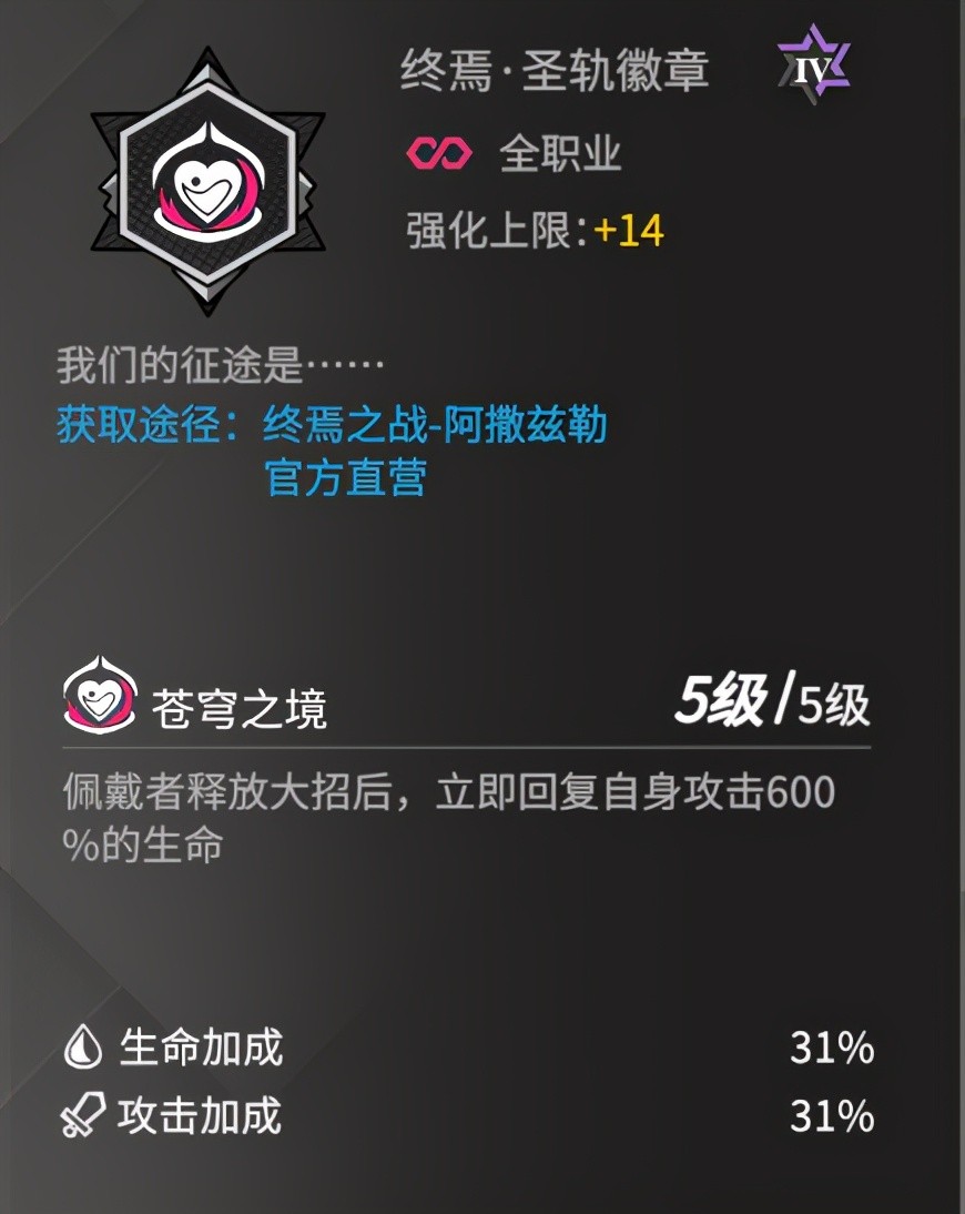菜刀队的徽章也是比较容易搭配的,以终焉神威主导,假如觉得某一菜刀练度拖了后腿很脆,能够带个终焉圣轨。射手或术士就按平时的搭配便可。