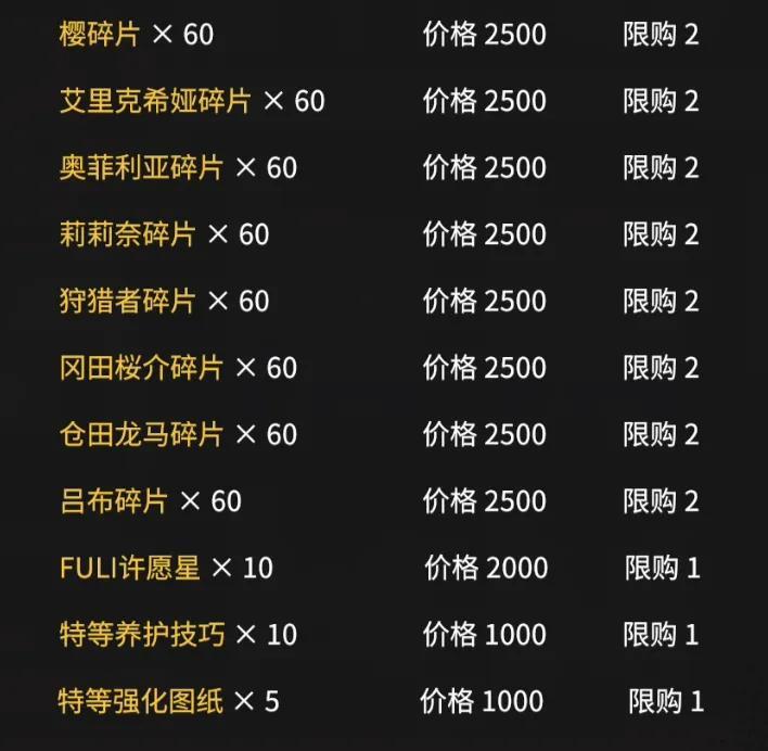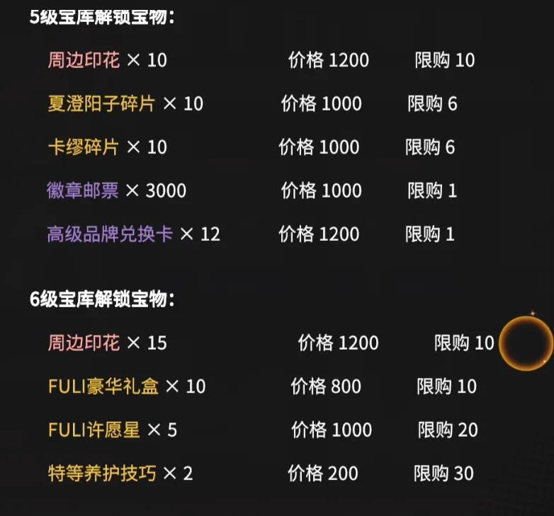 第4层第5层是主菜了。第4层FULI许愿星自然是最该换的,第5层的周边印花是非常好的奖励,但要花120王冠,不是很值得去换,比较一下第六层的印花,这才是最该换的。重要的是人物碎片,第5层能够换阳子、卡缪这二张闪卡的十个碎片六次,但不提议换,一则贵,二则平民玩闪卡比较难,还比不上把金卡多破2次。