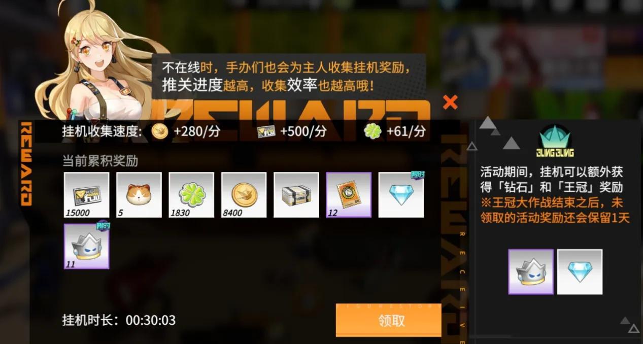 在线挂机的话王冠获得速度不太稳定,我自身检测每30分钟能得到十一个王冠,按七天算有一点不实际,且按六天半推算,能够领11*2*24*6.5=3432王冠。