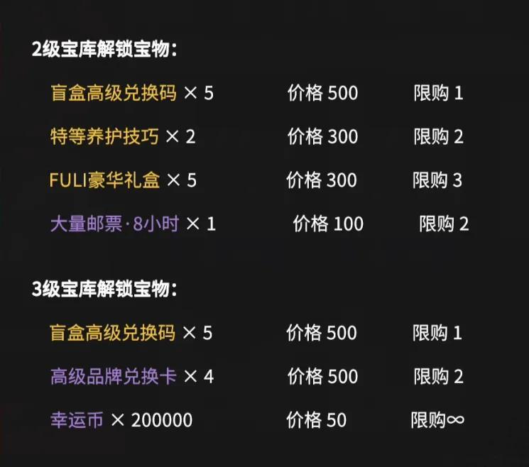 第1到3层比较容易,第1层换了FULI高级礼盒和高级盲盒碎片,还有徽章邮票,加起来300*2+200+100*2=1000王冠,但这还不足升层,再任意换一个物品。第2层换完盲盒高级换取码、FULI奢华礼盒装是500+300*3=1400王冠,恰好足够升层。第3层就不要想了,盲盒高级换取码、高级牌子换取卡换完。