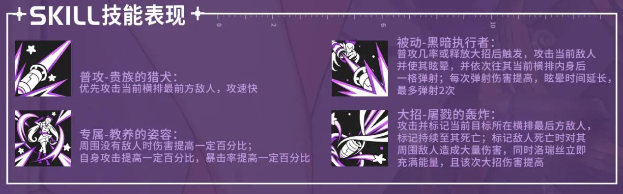 洛瑞丝在游戏中的定位是射手,现在官方只透露了洛瑞丝大概的技能,她的被动能够在命中首个敌人后,弹射到后排的2个敌人,弹射后的伤害与晕眩时间会慢慢的提高;尽管普攻有概率能开启被动的详细机制我们还不是很清楚,但是可以看出该技能具有很厉害的控制力。大招直接攻击横排的最后面的敌人,假如把目标击杀还能够引发爆炸性的伤害,并且马上施展伤害更大的下一轮大招,这两个技能加起来可以说是最强的后排杀手。