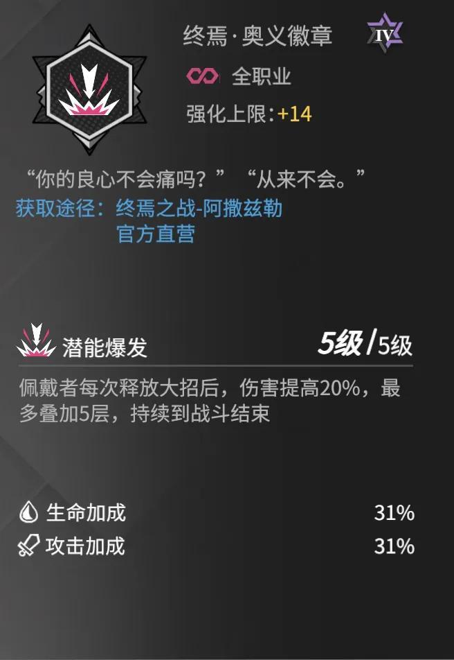 花迦作为斩杀型人物,虽然本来很脆,但不用特地选择生存率较高的徽章,和豌豆妹相似,花迦首先要带终焉·奥义,如此能够在大招发起时候提高斩杀成功的概率。