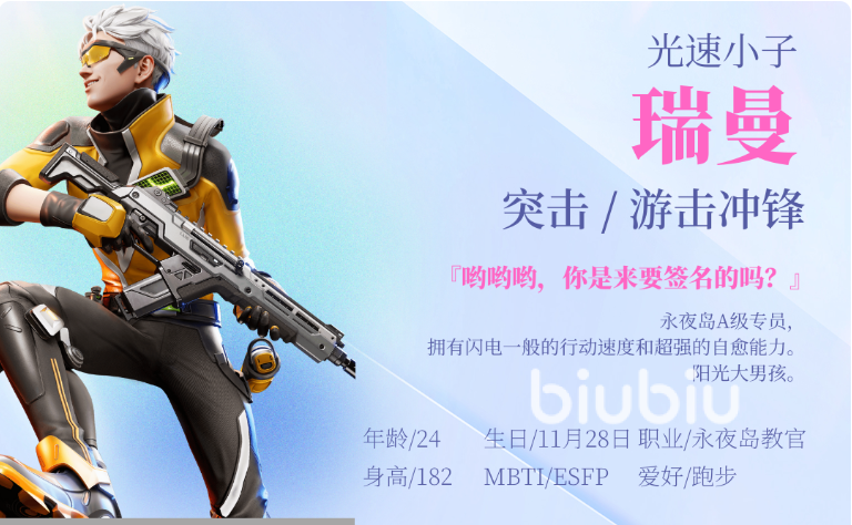 瑞曼隶属于永夜岛,是永夜岛的A级成员之一,因为瑞曼自身的高移动能力而被组织委以重任。瑞曼在永夜岛以非常优秀的成绩毕业,不仅如此,还直接留任永夜岛,成为了永夜岛的教官,这是瑞曼的大致背景,下文是技能讲解。