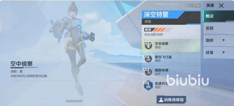 芬尼有两个被动,一个是空中侦查,游戏当中开局是需要跳伞的,芬尼在跳伞的过程中可以侦查到对手所处的位置的,包括是隐藏起来的对手;第二个被动是单兵飞行器,在长按跳跃这个按键的时候会启动芬尼的喷气背包,背包启动之后可以进行飞行,但是飞行的过程中不能对对手进行攻击。