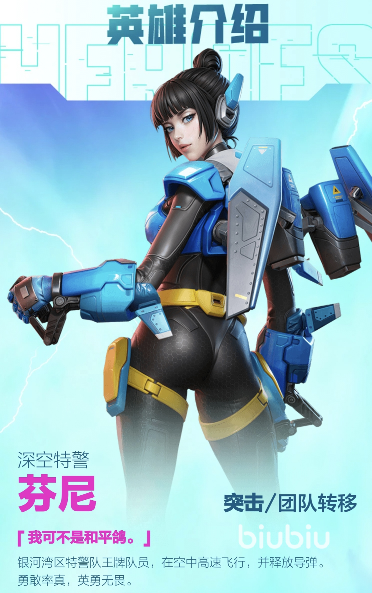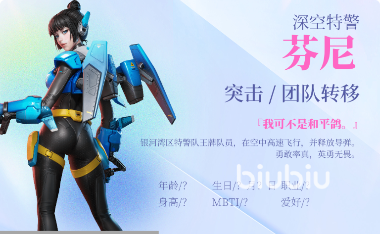 芬尼隶属于银河湾区特警队,是特警队的精英王牌成员,性格方面既勇敢又无畏,是一个生性率真的美少女。芬尼在团队中的定位是突击的位置,擅长进行团队的转移工作,是作战当中的一个良好的伙伴。
