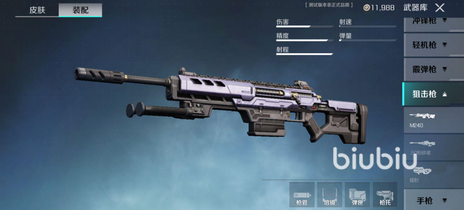 这边比较推荐各位玩家们使用M240狙击枪,这是一款非常优秀的高性能栓动式狙击枪。是目前游戏当中,除了镭射以及空投武器以外,单发子弹伤害最高的狙击枪。只要打中了人,那么至少是70点伤害,充能之后能打到90点伤害。如果在充能情况下爆头,可以直接击倒蓝甲以下的敌人。唯一的缺点就是狙击武器需要足够好的视野,正好可以搭配维德这种可以放眼的角色。