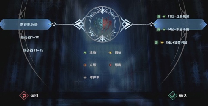 首先,我们点击进入游戏之后会自动跳出来让我们选择服务器的界面,目前游戏一共开放了15个服务器供大家选择,而这个15个服务器也有其不同的状态,分别是流畅、拥挤、火爆、爆满以及维护中,分别是以绿色、黄色、橙色、红色以及灰色的图标进行区分,非常直观。