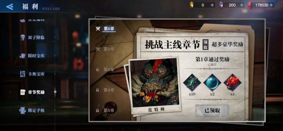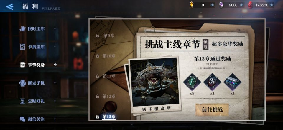 一直向下拉可查看所有章节的boss,也可以知道最后一章,第十三章的通关奖励,至此我们可以了解全部十三章的基础信息。