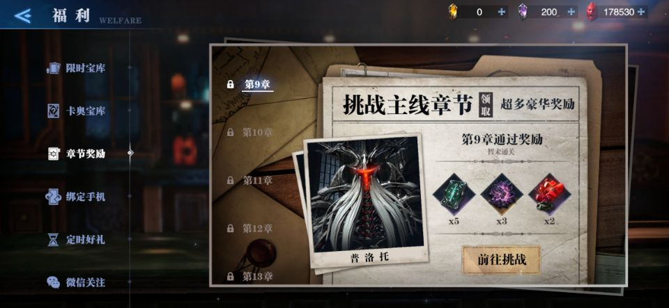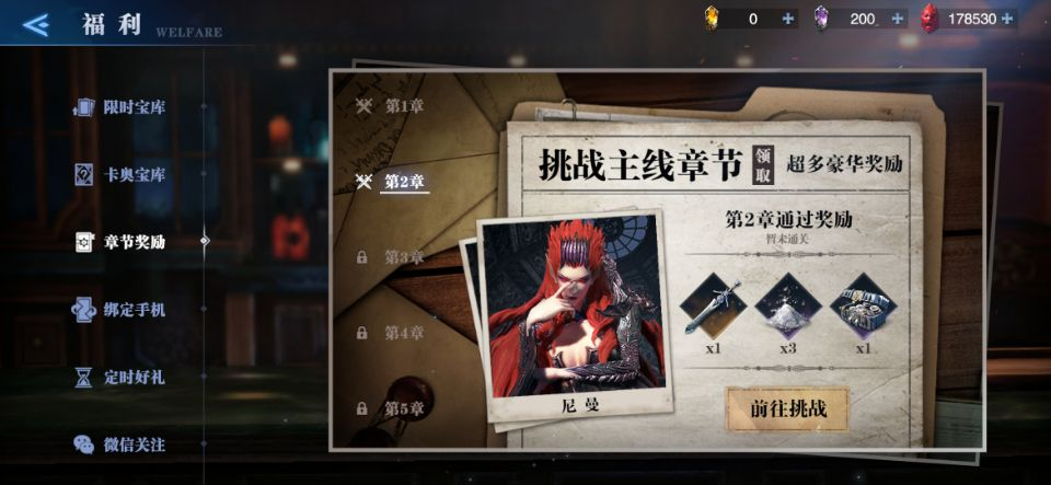 点击屏幕右边的“福利”会弹出近期的各种活动,以及各种关卡类永久活动,而往下寻找我们可以看到在章节奖励这一界面可以领取到我们通过对应章节的奖励,而未通过的关卡虽然奖励无法领取但是可以向下提前查看各个章节的简述。