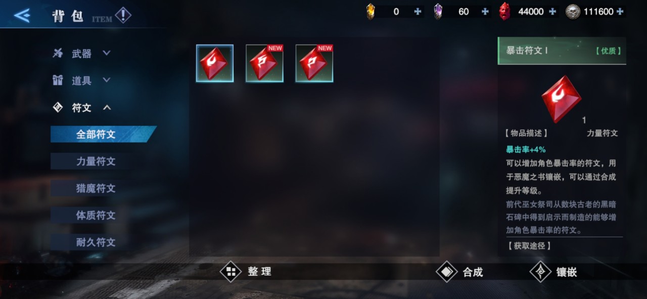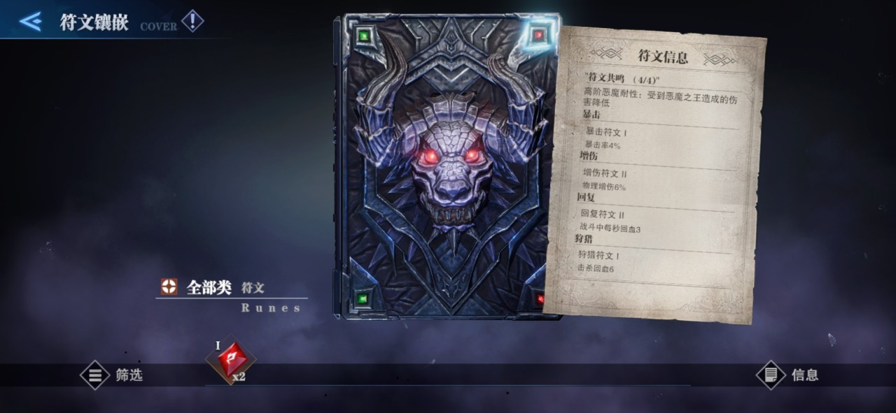 符文那一共分为四大类分别是力量符文、猎魔符文、体质符文,耐久符文。每个大类符文下面还有各种效果的符文。力量符文有一些攻击力以及暴击率跟爆伤的符文,猎魔符文则是一些boss伤害以及恶魔伤害的一系列符文、体质符文则是一些抗性以及减少伤害的符文,耐久符文则是一些战斗回血回蓝之类的符文,总体来说一个好的符文搭配,影响你的刷图难度。