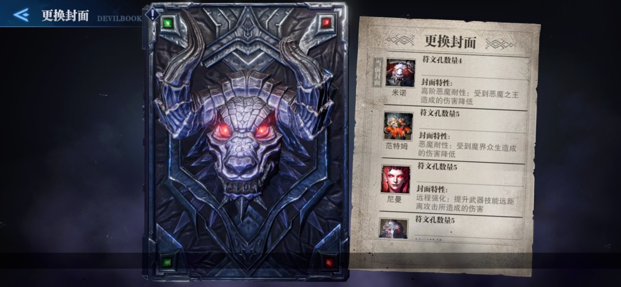 值得一提的是恶魔之书是可以选择封面的,你只能选择其中一个封面,封面的获得方法都是击败各个章节的boss就可以得到也就是说,可以选择的封面大多数为你所击败过的boss,每个封面都有不同的属性以及可以镶嵌符文孔数,同一种名字的符文只能镶一次。每一封面可以镶嵌的符文孔数量都有限制,选择恶魔之书的封面对应着你可以镶嵌符文的个数,以及把封面的孔数都镶嵌满之后就可以激活封面的属性了。所以说,你所选择封面的孔数最好是能全部填满才能发挥封面的效果。一套合适的刷图符文,能给你刷图减少不少时间,强化你的作战能力。