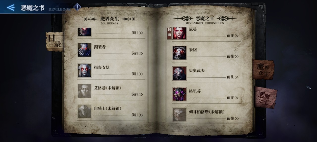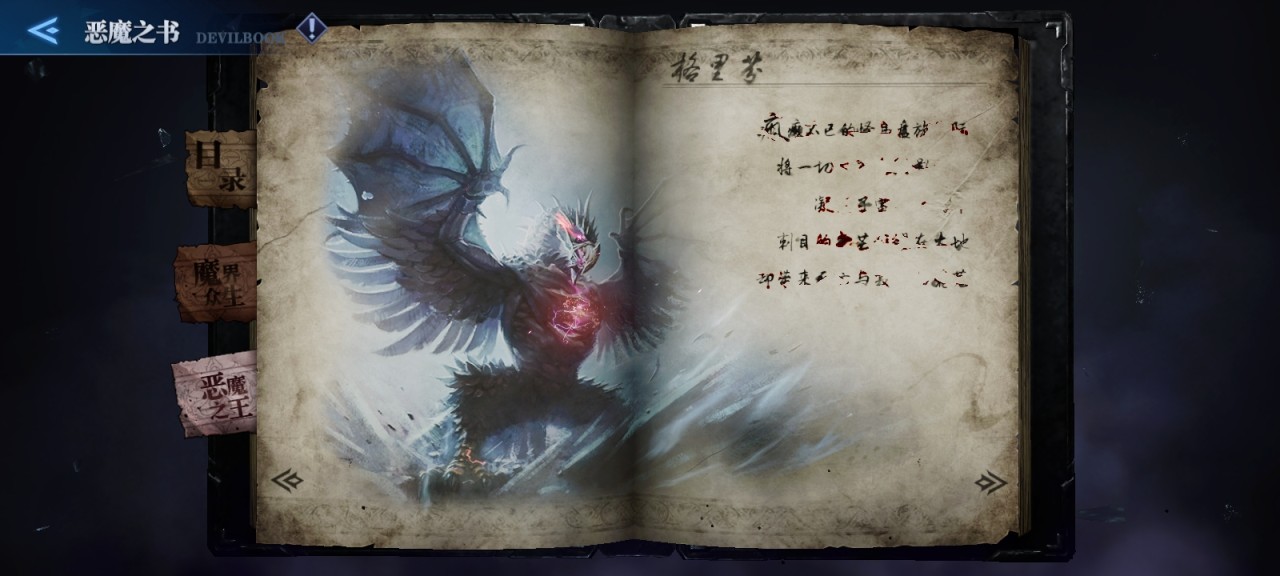 第二种恶魔的收集,恶魔的收集只能出现在主线任务中,其他的活动都不能增加恶魔之书中对恶魔的收集。也就是只能完全击败恶魔后才会出现在恶魔之书中。在恶魔之书中存在两种恶魔,魔界众生和恶魔之王。相较于魔界之王魔界众生更加容易遇见和被收录在恶魔之书中。点击开每种恶魔都会有对各种恶魔的介绍。