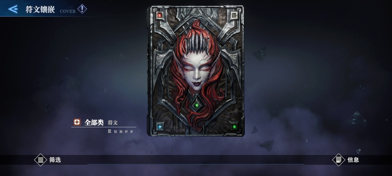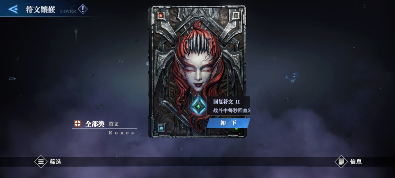 符文可镶嵌在恶魔之书上增加角色的属性,其中符文一共有四种,分为耐久符文,体质符文,猎魔符文和力量符文。不同的符文对不同的角色效果不同,在镶嵌符文前,要充分综合角色的属性。符文分为不同的等级,低级的两个相同的符文可以合成更高一级的符文。