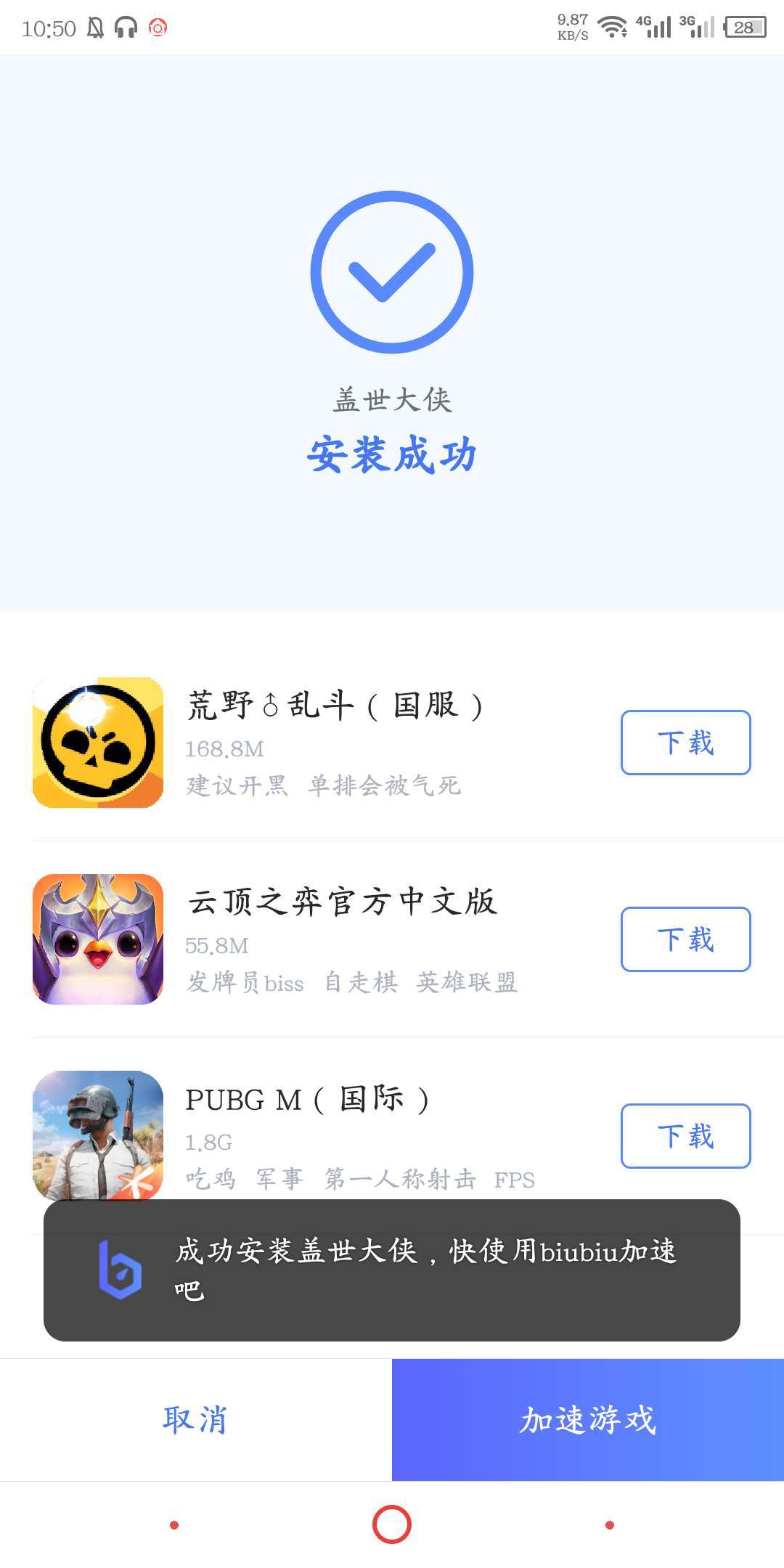 下载好了之后点击安装,在安装成功的界面,玩家可以直接使用biubiu进行加速。由于盖世大侠是国服的游戏,所以不需要下载谷歌安装器,也不用选择外服,直接使用biubiu分配的VPN进行加速就可以了。