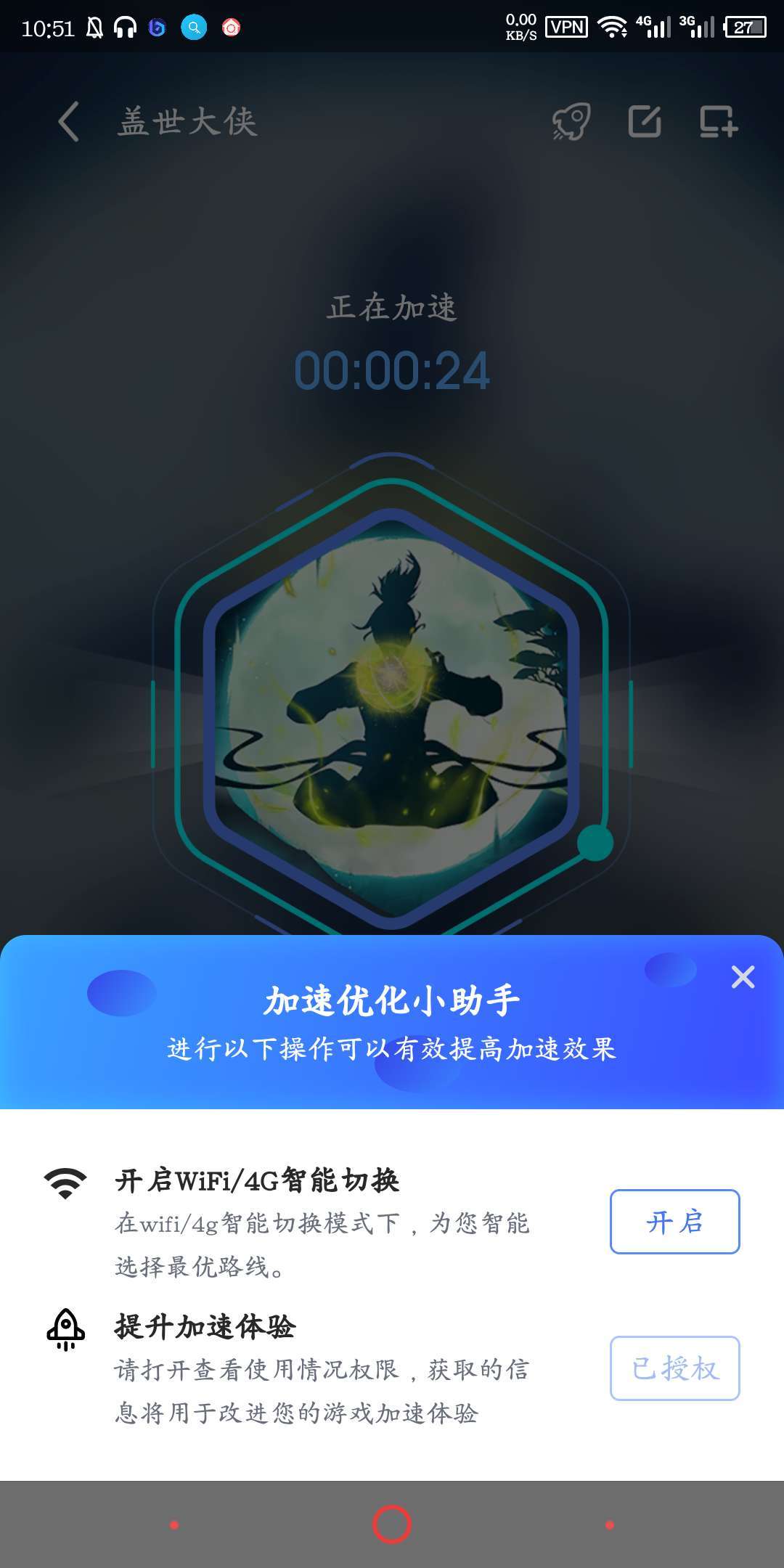 在加速成功的界面,玩家可以查看本次的加速效果,在右上角小火箭出现提示的时候,可以点开来设置优化选项,以加强加速器的效果。