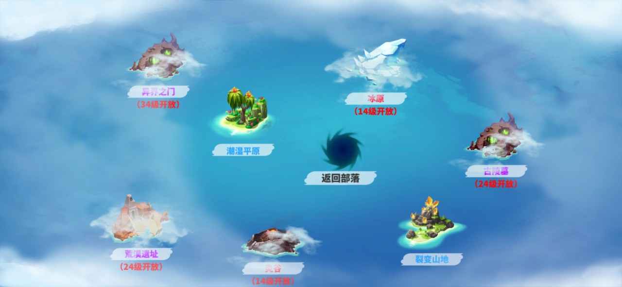 进入大地图后,我们可以看到游戏现在一共有七个地图,分别是异界之门、荒漠遗址、潮湿平原、炎谷、冰原、裂变山地、古陵墓。今天我给小伙伴们带来的就是潮湿平原攻略了。