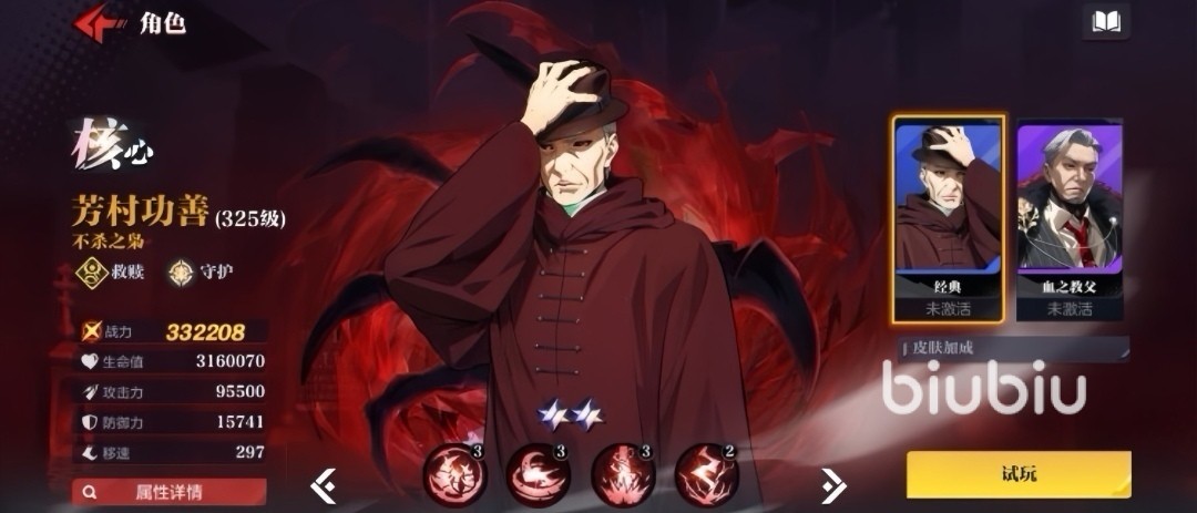 第三位介绍的是芳村功善,一人可以保障全队的生存,其能力集合了吸血、眩晕、复活三种,他会在血量岌岌可危以及怒气值完全拉满的两种状态下变成【赫者形态】,攻击力可以直接上涨80%,吸血能力也会增加,普攻能直接变AOE,还带有50%的眩晕效果,在该形态下,用【枭爪】直线拍向地板,伤害会是平常的1.5倍且能击倒对方。如果被秒杀的话,直接满血复活,再能开一次大招,特别强悍。