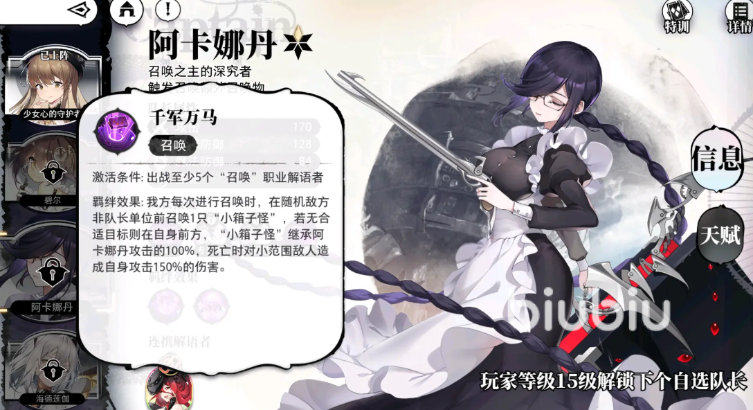 队长选用阿卡娜丹(阿卡丹娜):登场技直接激活召唤者阵营羁绊,便于召唤体系快速运转。