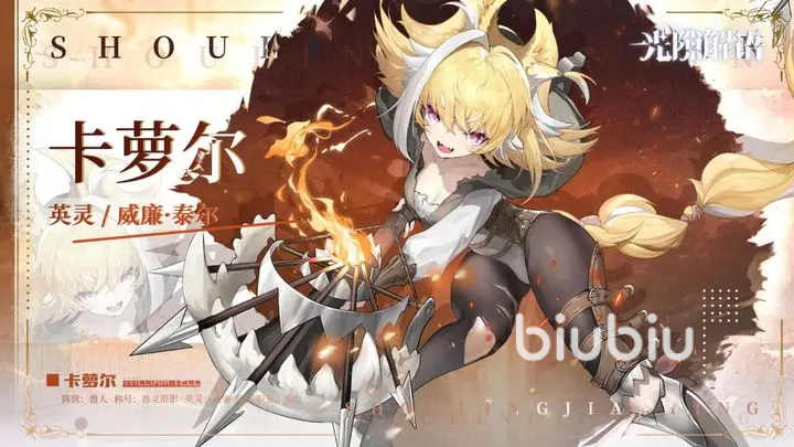 卡萝尔是兽人阵营的群上输出英雄,能迅速进行大范围的伤害,具有点燃的特性,能给敌方英雄在开局就大幅降低血量。1技能”分裂射击”,对一列敌方目标造成高额物理伤害,技能升级还能大幅提高伤害效果。2技能”燃烧兽夹”,给目标附加2层“点燃”,该目标行动后失去血量,后续有额外概率再附加1层。3技能“狩猎天赋”,攻击力和血量提高。4技能“埋伏”,战斗初始给随机的2名目标添加“点燃”,每回合有几率给随机的1名敌方单位附加该效果,升级后提升概率,附加的人数也增加。