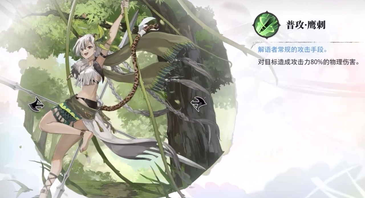 莱珀的普攻“鹰刺”会对距离最低的敌人造成物理伤害,她的登场技“湮渊环噬”能让自己在登场的时候,立刻获取到2点费用,随后拿着长枪瞬间冲刺,攻击身前一定矩形范围内最远的一个单体敌人。