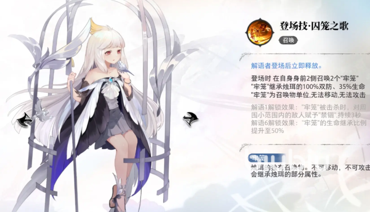 烛珥同样是五星,她在守护职业属于比较特别的召唤流,召唤出来的囚笼能帮助抵抗大量的伤害,生存能力很强,她的“囚笼之歌”会在登场时,在自己的身前两侧召唤出2个囚笼,囚笼会继承烛珥100%双防,以及35%生命,强化后囚笼在被击杀后会对周围小范围内的敌人赋予禁锢3秒,她的“囚笼之鸟”会在场上存在牢笼的时候,为它们回复一定的生命值,若场上没有,还会在自己的身前召唤出1个。