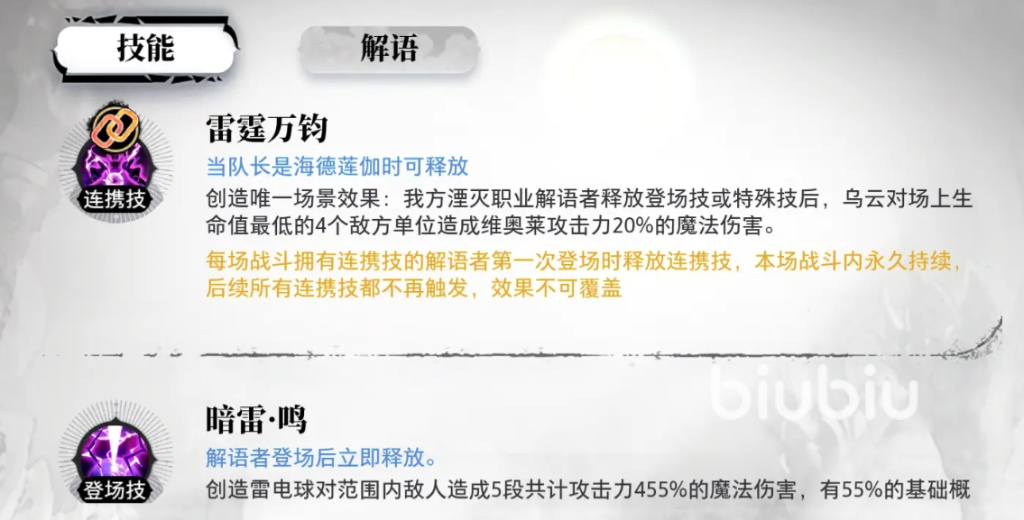 湮灭是目前除了召唤以外,另外一个较为主流的打法,主要特点是通过大量的范围输出,打出混合群伤的作用,在pve中有着相当不错的表现力,队伍的队长是海德莲伽,她的“雷霆万钧”可以在我方湮灭解语者,放出特殊技或者是登场技后,出现乌云对产生生命值最低的4个敌人造成一次20%魔法伤害,队员有维奥莱、御、莱贝特加随机的3个湮灭职业,维奥莱和御打核心输出的;