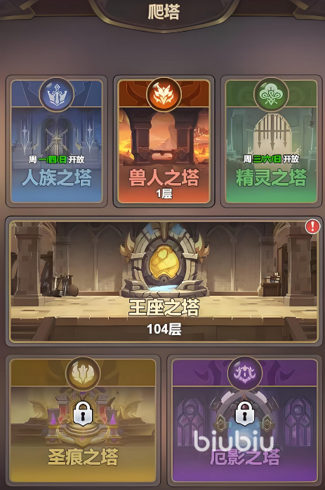 在爬塔的时候,一共提供了6种不同类型的塔,分别是王座之塔,人族之塔,兽人之塔,精灵之塔,圣魂之塔和厄影之塔。不同塔在战斗过程中对于阵容的要求也不同。首先是王座之塔,任何阵营的英雄都可以在这里上阵挑战。人族之塔,需要王座之塔里面爬塔,达到100层之后才会解锁,在每周的一、四、五开放,这里只能上人族阵营的英雄。另外两个兽人之塔和精灵之塔,也是同样的设定,都是在王座之塔100层之后解锁。兽人之塔,在每周的二、五、日这几天开放,只能上阵兽人阵营。精灵之塔是在每周的周三、周六周日开放,只能上阵精灵阵营。
