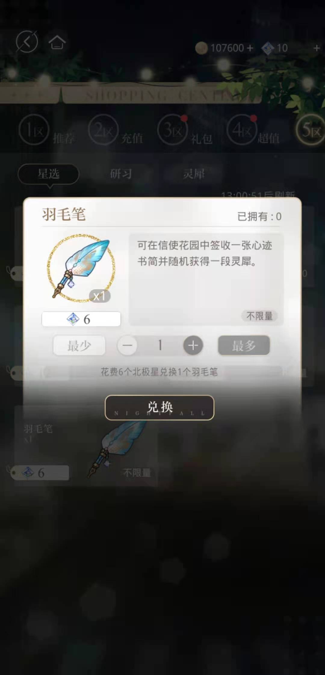 三、商店购买。每6个北极星能兑换1个羽毛笔,如果是新手礼包、活动限定礼包、月卡等会更优惠。