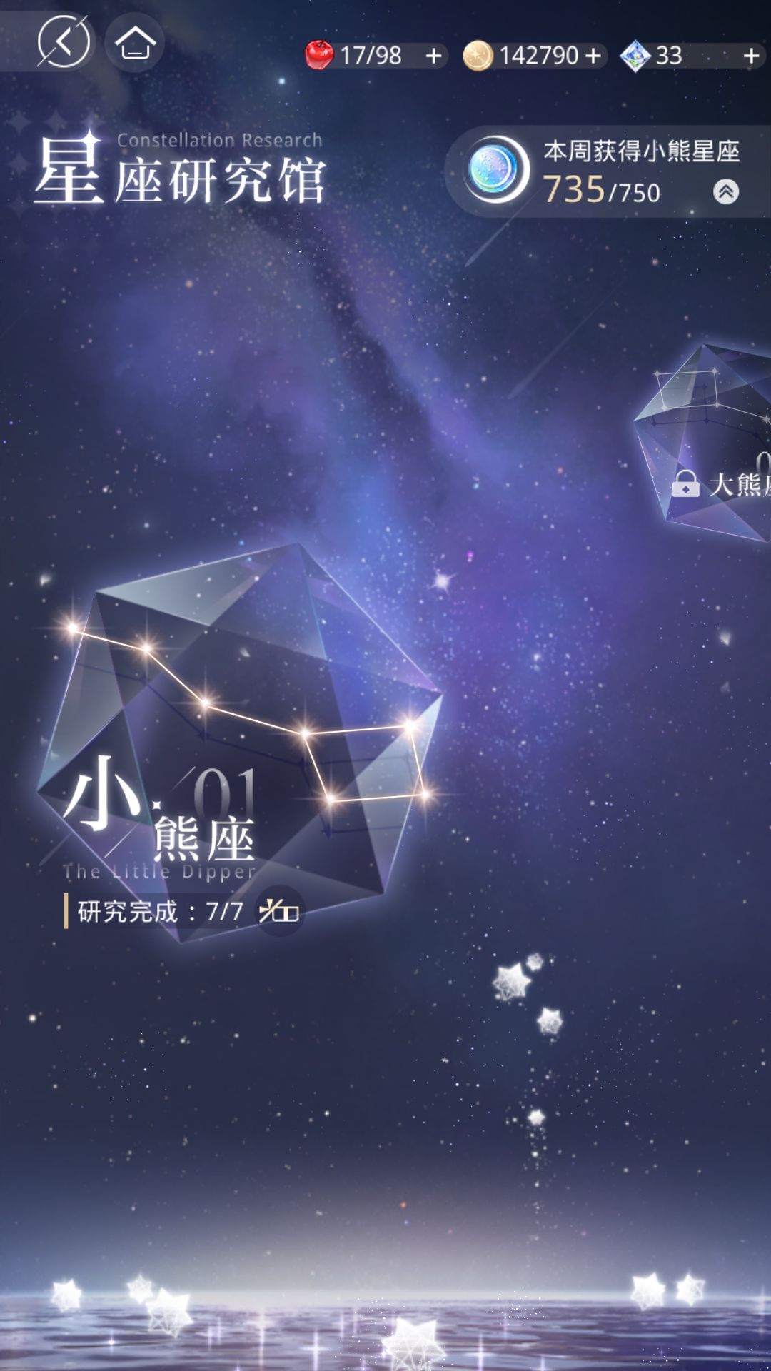 另外在完成主线的4-6章节会开放【星座研究馆】副本,在这个副本里,每周可以获得有上限的小熊星座。