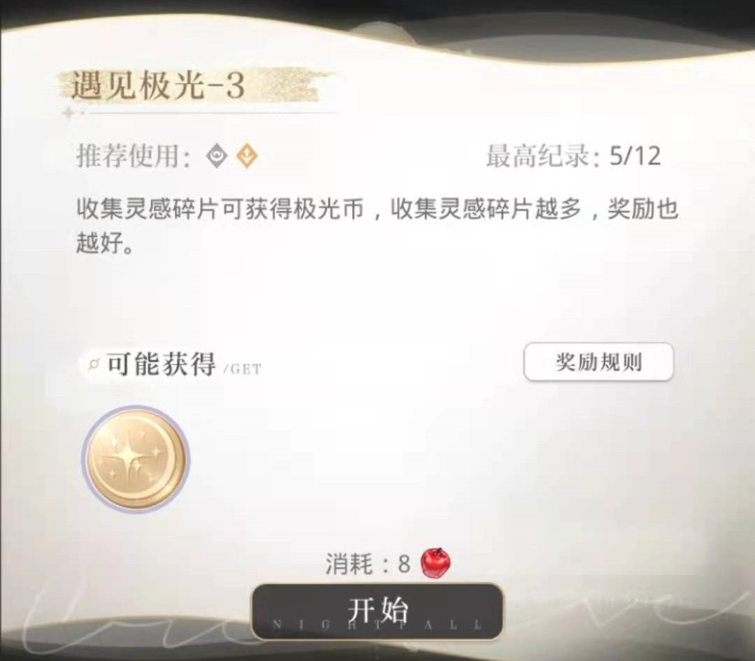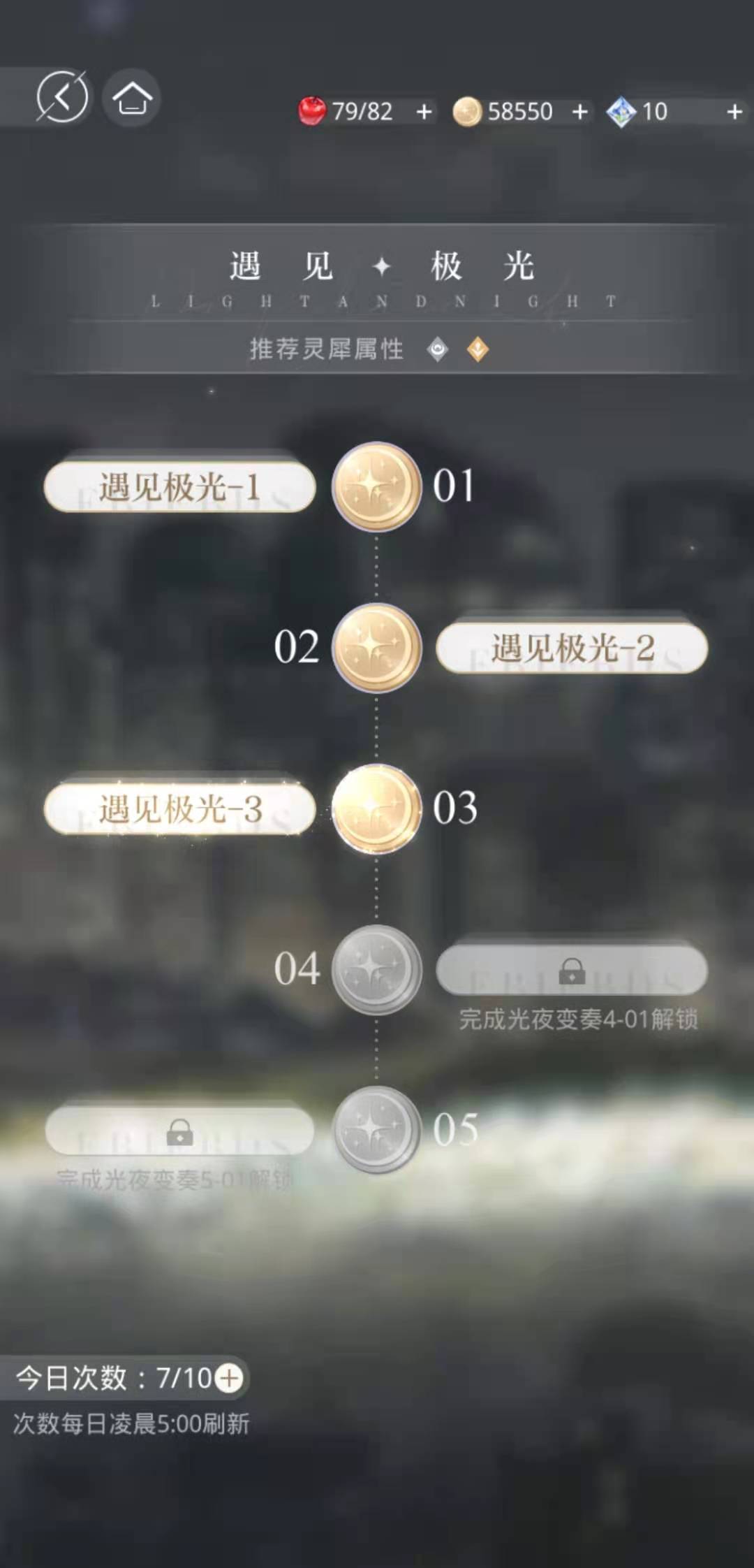 遇见极光是在材料副本“光启西岸”里,专门刷极光币的副本,前两关比较简单,第三关开始就有难度。作为专门刷极光币而且有次数限制的副本,而且每天自然恢复的体力很少,所以小编的建议是在解锁遇见极光之后,能通到多少关就通到多少关,并且每天一定要把体力刷满。