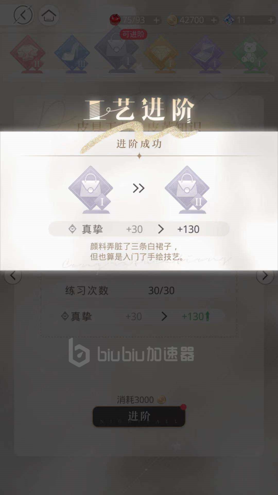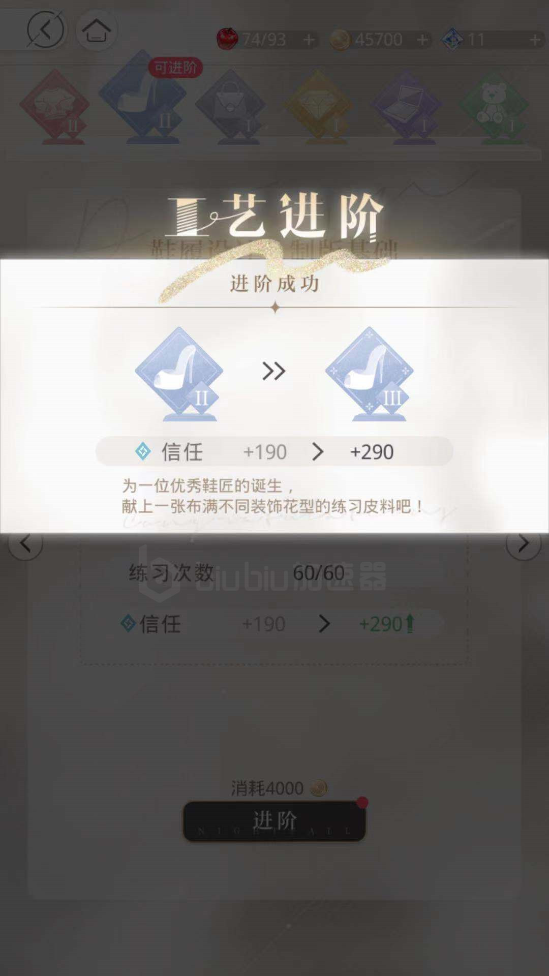 点击练习后,可以看到通过消耗纹理木板道具,纹理木板道具可以通过商城兑换和研习活动获得,当获取到后,可以通过此道具进行不断的练习,当练习次数达到符合的标准后不断的增加联系次数和信任,即可消耗金币成功进阶,顺利的完成此鞋履设计工艺。