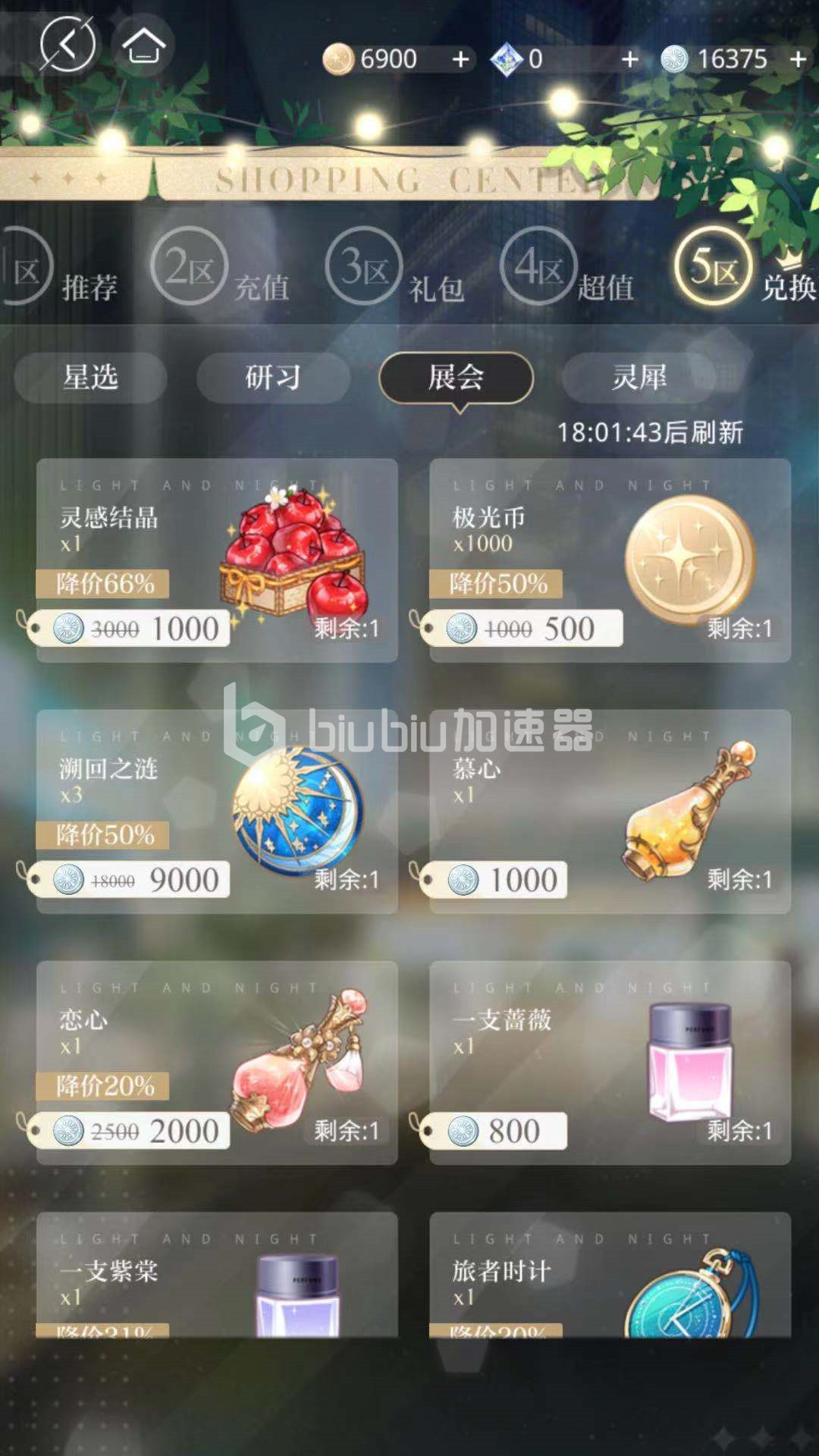 玩家还可以通过商城进行兑换,在首页面中可以看到购物页面,进入后可以看到商城包含不同的区域,在5区中包括星选,研习,展会,灵犀等页面。