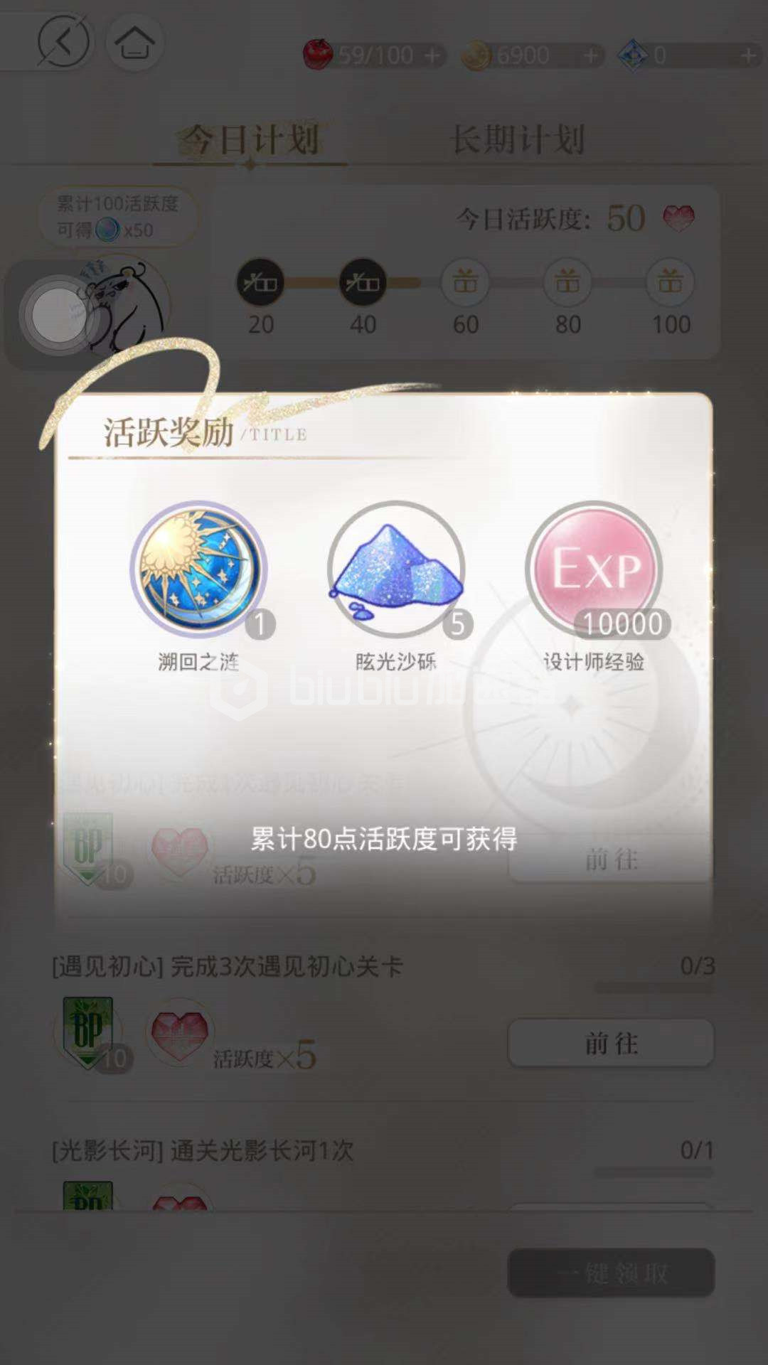 玩家进入游戏后,在主页面中选择计划进入详细页面,可以看到包括今日计划和长期计划,在今日计划中通过提升活跃度获得相应不同的奖励,在活跃奖励中可以看到,当活跃度到达80时,可以获得溯回之涟,沙砾和设计师经验道具。