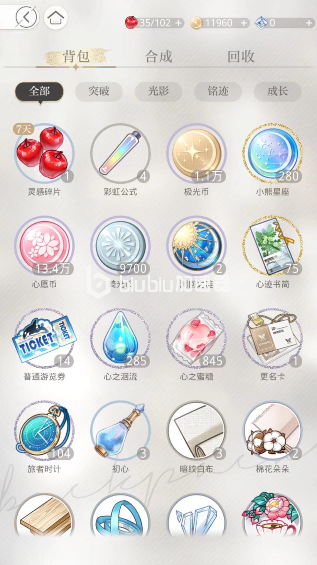 玩家进入游戏后,可以在主页面中看到成长,物品等相应的页面,在物品页面可以看到包括背包,合成,回收,在背包中可以看到目前所拥有的道具,其中包括溯回之链道具,溯回之链是用于重置光夜变奏中光页选项的道具波动时间,水面日月交替变换,不要害怕,最后的最后总会有繁星照耀。
