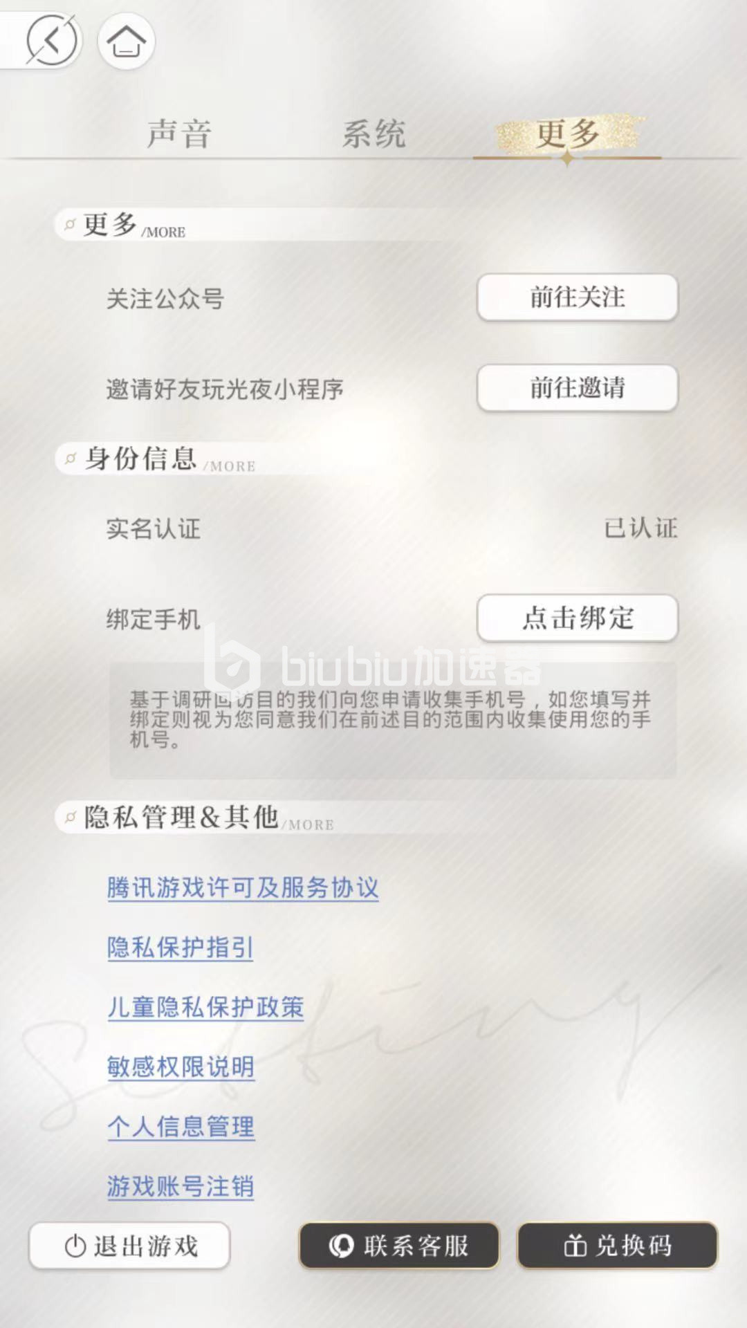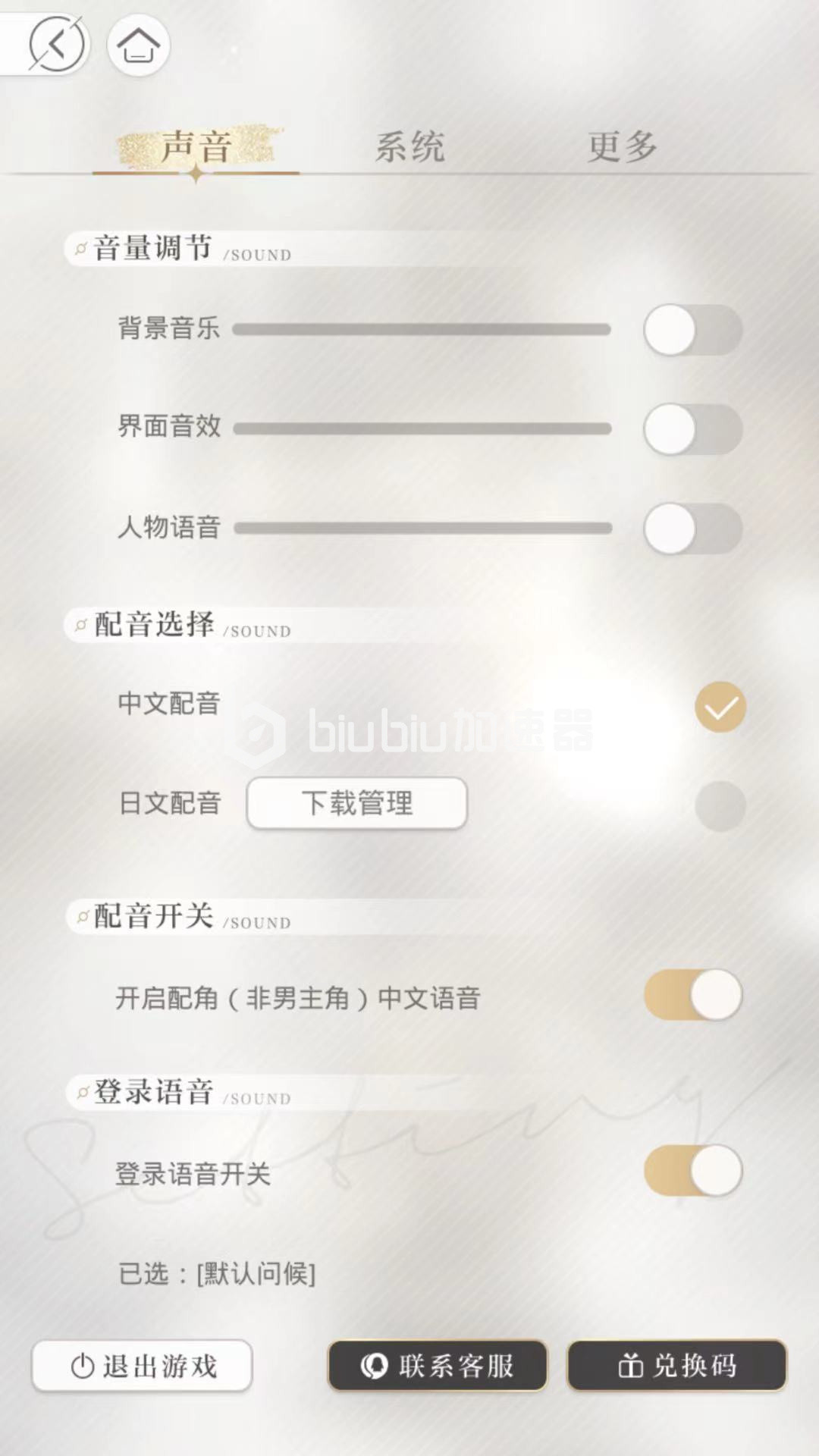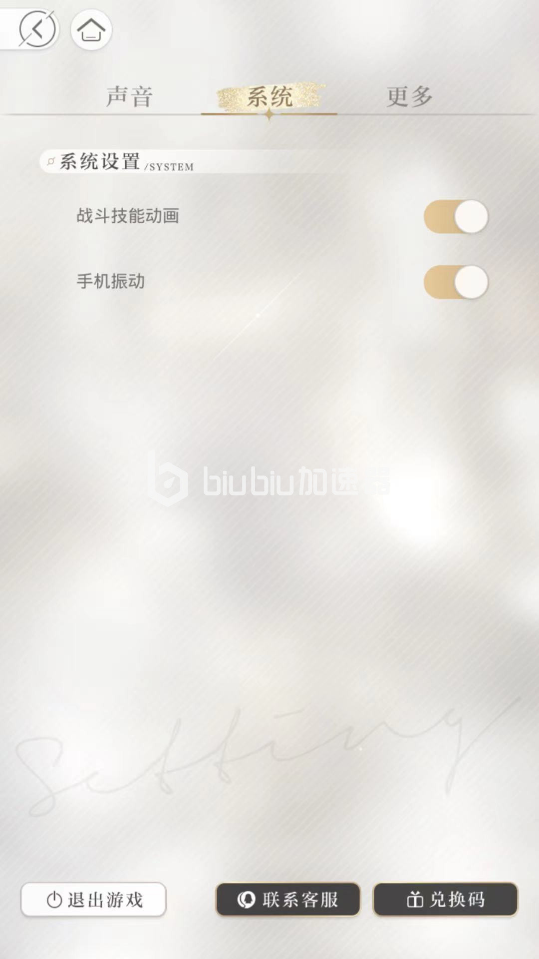 玩家进入系统后可以看到包括声音,系统,更多页面,最下方包括退出游戏,联系客服,兑换码功能,通过退出游戏即可退出整个游戏进入登录页面,通过输入兑换码可以直接获得相应的游戏道具奖励。在声音中通过改声音的音调,配音选择和配音开关等方式后,角色可以获得相应的声音。在系统中玩家可以设置系统的战斗技术动作和手机振动模式。