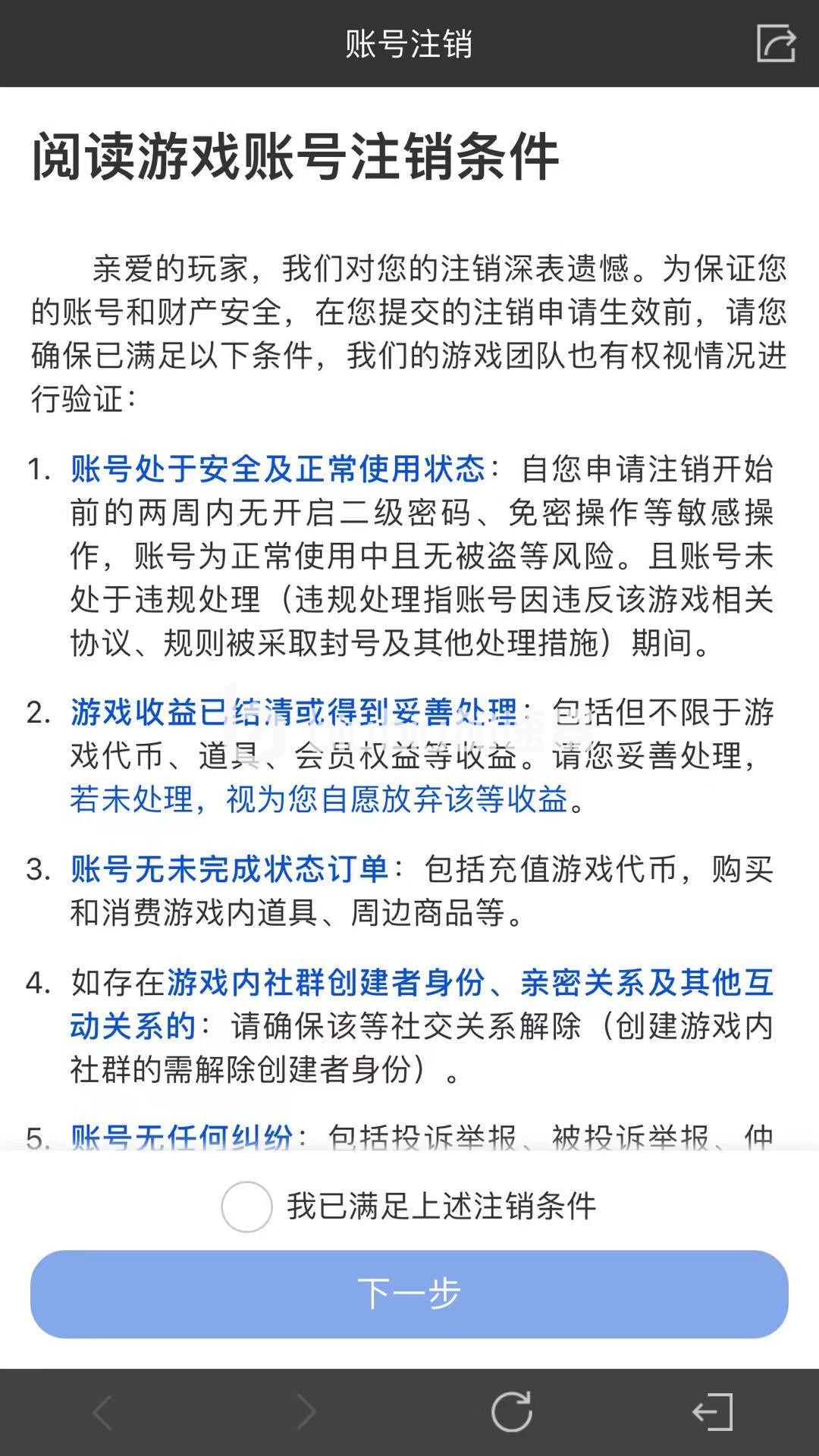 在更多中可以看到包括更多,身份信息,隐私信息和管理其他。在身份信息中玩家可以通过实名认证和绑定手机的方式获得相应的道具奖励。在隐私中包括多种的隐私,还有个人信息的管理,最后包括游戏账号的注销。玩家进入游戏账号的注销功能后,可以看到玩家需要阅读游戏账号注销的条件,当阅读完毕后选择我已满足上述注销条件,即可进入下一步。