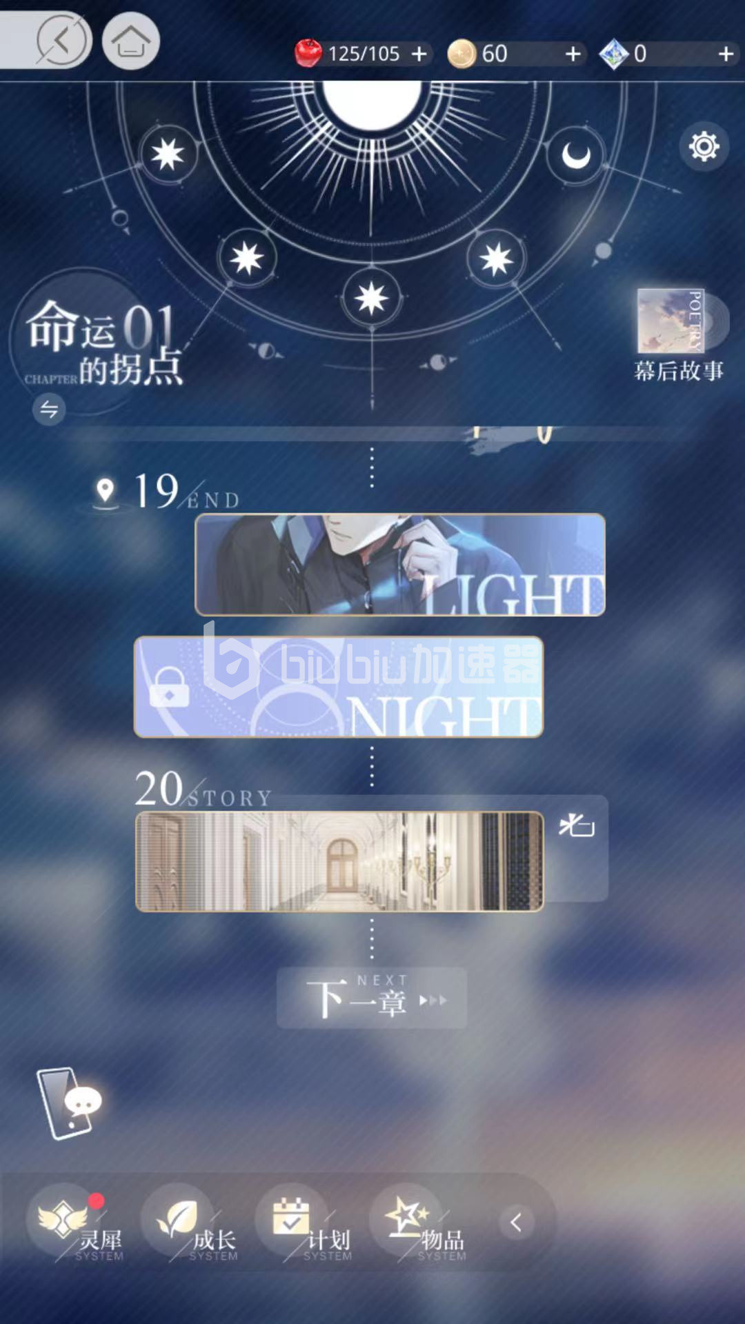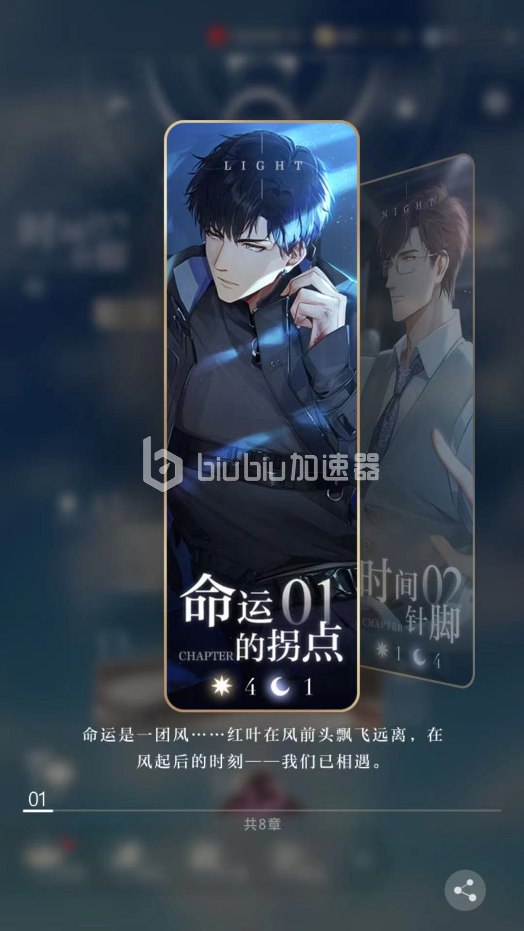玩家进入光与夜之恋游戏后,可以看到在光夜变奏中包括不同的章节,通过完成上一个章节,可以开启下一个章节的模式。