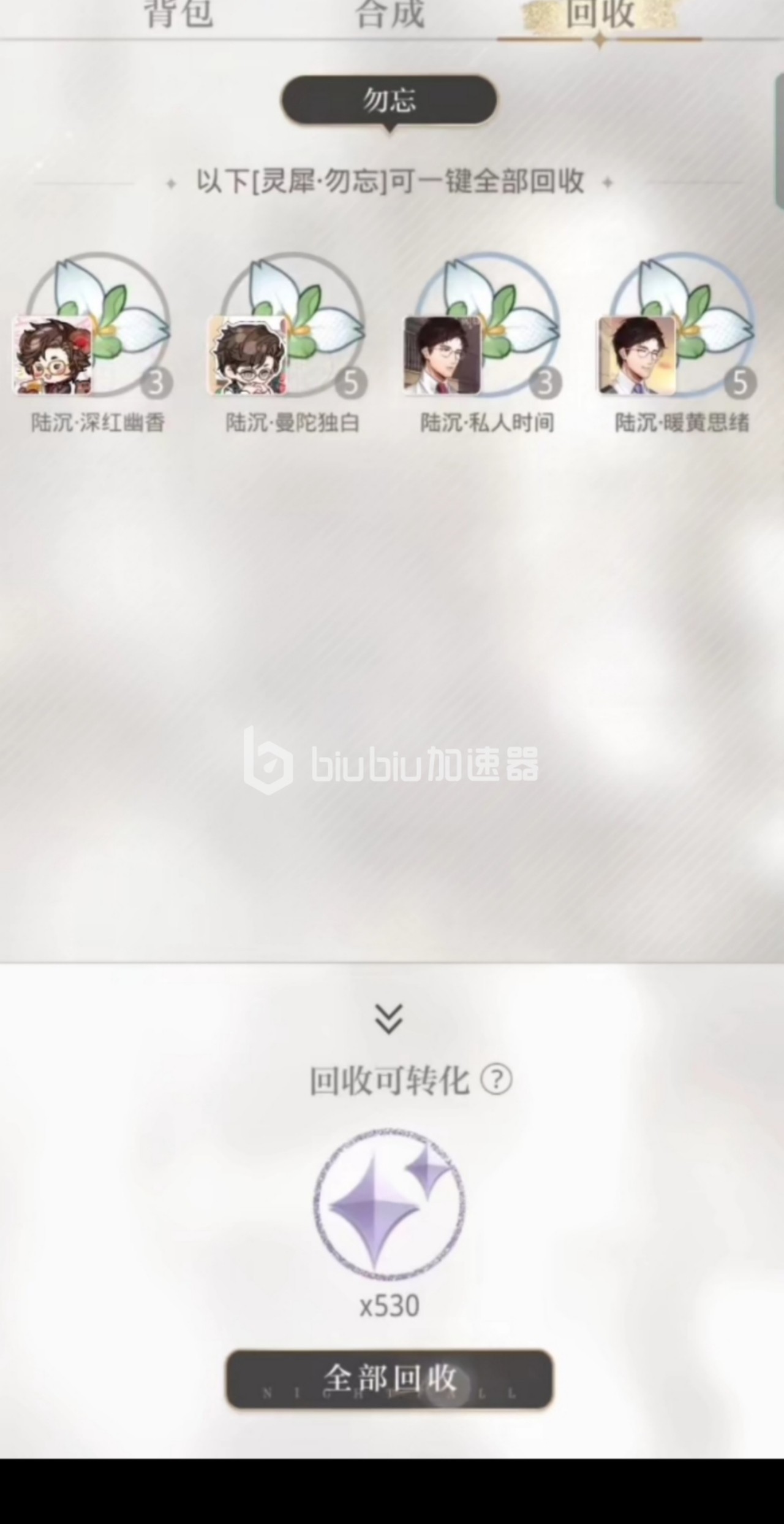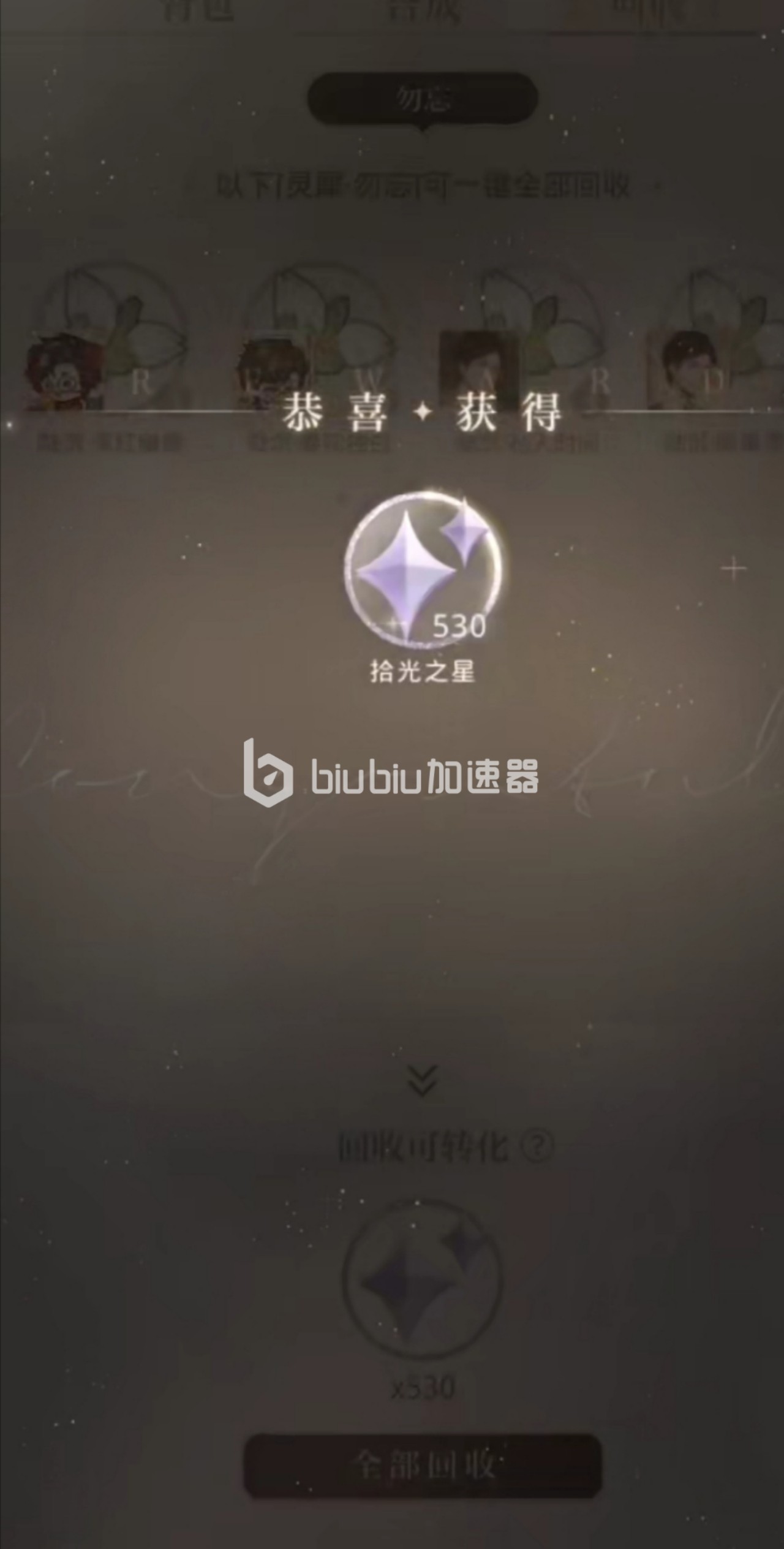 回收灵犀获得拾光之星需要抽到六张以上重复相同的卡,等到把同名的卡牌将其升星到五阶后,后面再抽到的所有同名卡牌,就会出现在回收仓库中回收勿忘。再升到满级之前,抽到同名的卡牌将会叠卡,获得更高的属性加成,一张卡牌到达满阶后,后面所有的卡牌产出才可以回收成拾光之星。