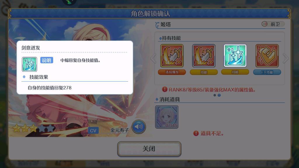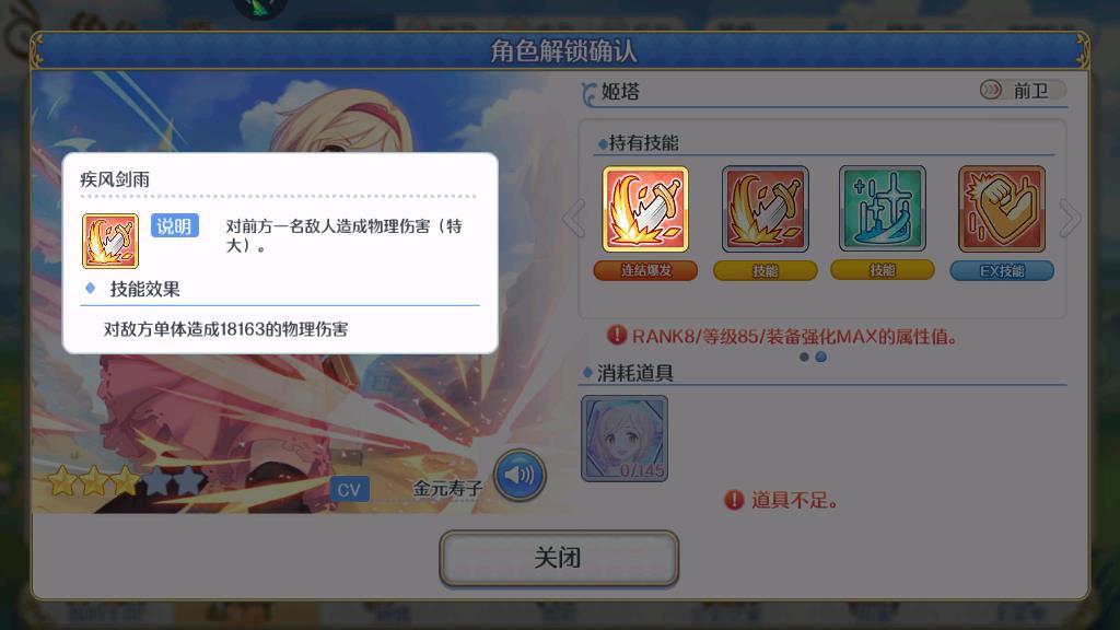 在技能的设定上,姬塔的奥义技能“疾风剑雨”会对前方的一个敌人造成大量的物理伤害,技能等级升到满级之后,基础伤害为18163,算是比较强的一个爆发技能。被动技能“剑意迸发”在使用之后可以恢复大量的技能职,该技能就是姬塔爆发能力的保证,可以让姬塔比较频繁的使用奥义技能来攻击敌人。