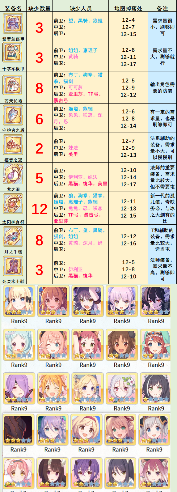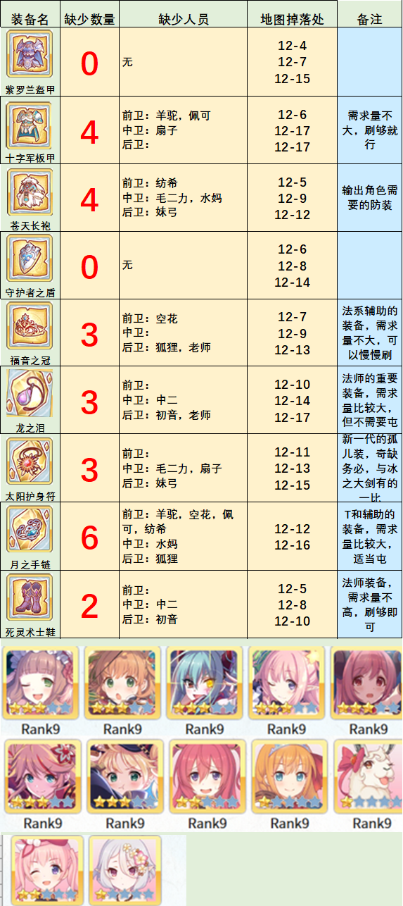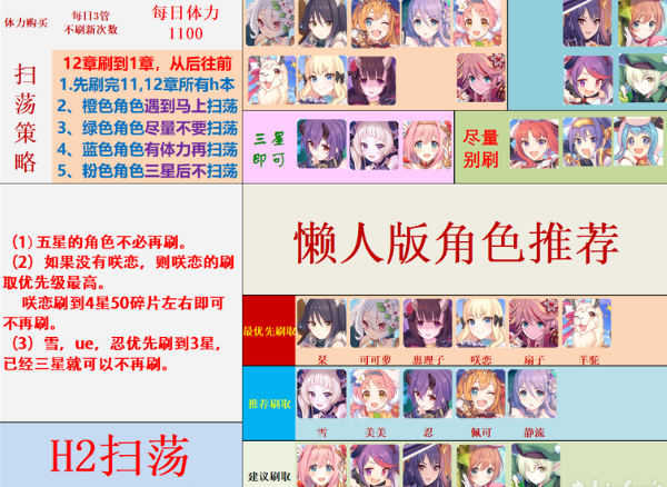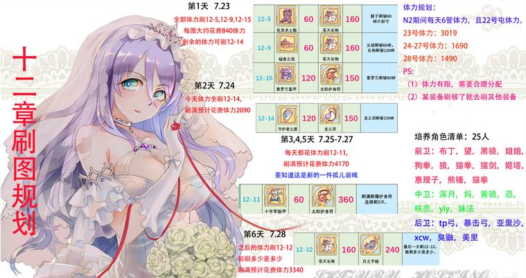 4、这次刷取计划仍旧以工会战人物先行。若每一天6管体力,配上前天卡体力的话,是够刷完这一些人物的,请宁神。