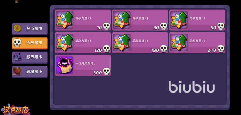 点击黑市,在这里使用金币、杀敌数、影币、恶魔之心资源,分别可以换购装备、属性成长、法术书、宝物等不同的道具,提升实力,这些资源中影币可以通过影币挑战、选择强化三选一获取,恶魔之心需要通过恶魔挑战。