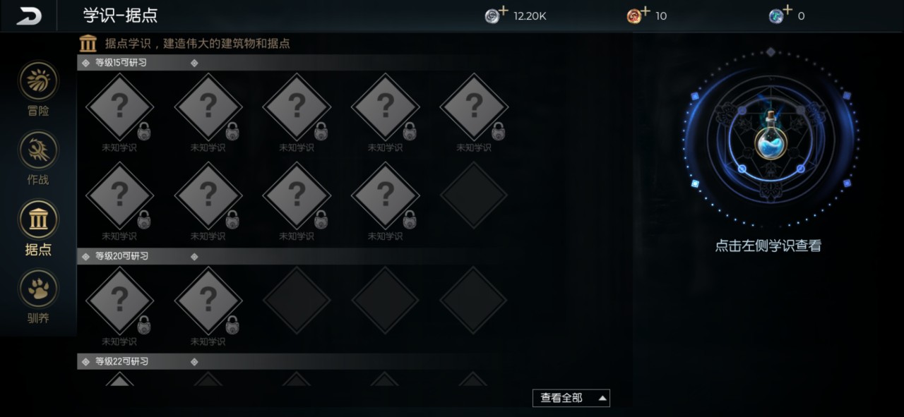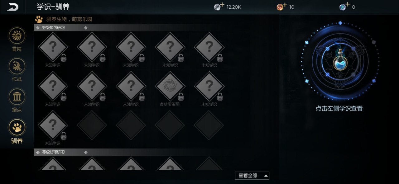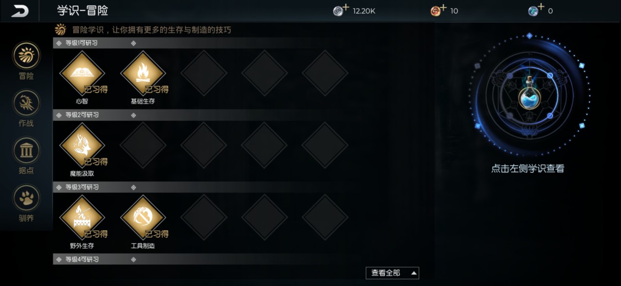游戏内目前的四个学识选项分别为冒险、作战、据点和驯养,升级冒险学识能够让大家生存和制造的技巧更加精湛;升级作战学识可以让大家在同怪物的战斗中更加方便简单;升级据点学识可以建造一些伟大的建筑物和据点;升级驯养学识前提条件必须大家达到十级,接下来就可以驯养一些宠物。