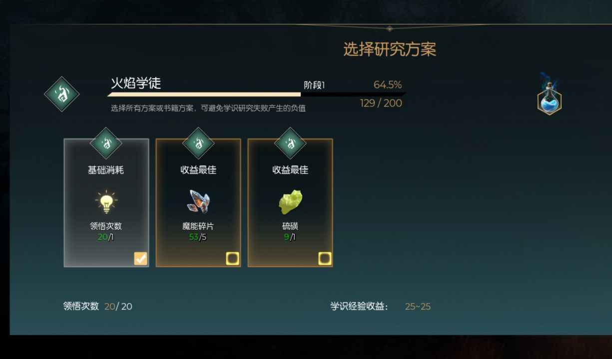 具体需要消耗的材料和资源是根据大家的学识研究方案变动的,比如说攻击类的学识则需要大家消耗一些魔能碎片和硫磺,一些资源建造类的则需要消耗一些树木、露水,只要消耗资源的话成功率会达到百分百,而且学识经验收益也会更多。