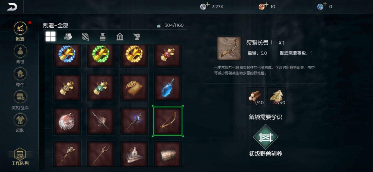 在游戏内还有很多能够减少动物野性质的装备,比如说骨矛就是一把常见的狩猎兵器,比较方便携带,而且伤害比较高,需要使用30个木头和45个骨头来进行制作,如果没有专业的诱捕长弓,可以使用狩猎成功来进行替代,需要使用40个木头以及40个骨皮来进行制作。