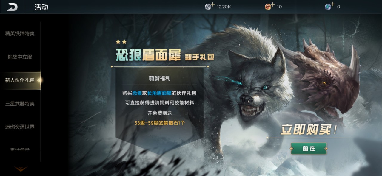 在前期的战斗中玩家们经常会遇到一些鬣狗和铁面军团的怪物,这些怪物都是有着AI操控能力的,只要靠近之后就会自动攻击玩家们,如果没有伙伴以及宠物来帮助战斗的话那必定打不过,这个礼包可以直接让大家免去培养直接获取一个56级恐狼盾面犀,属于游戏中最强的宠物。