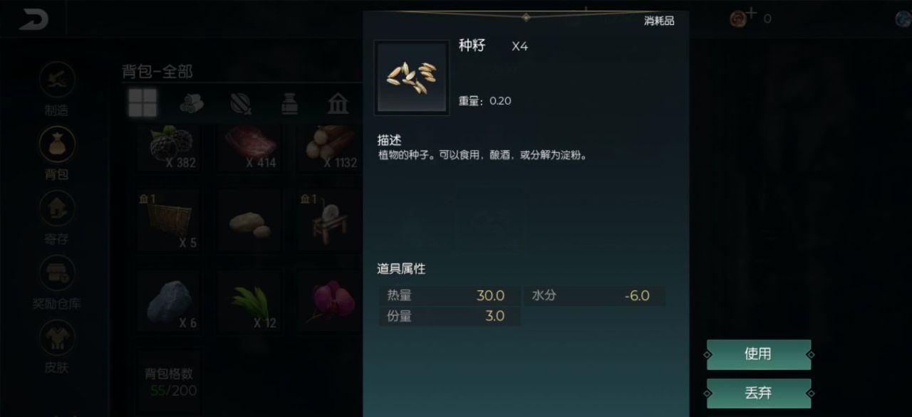 种籽获取之后可以直接食用,会给玩家们带来一定的热量和能量,但是吃多了之后会拉肚子,让玩家们在游戏中的体力耐久值下降,所以最好使用研磨器制成淀粉,加工成面包和奶酪这类食物再食用。